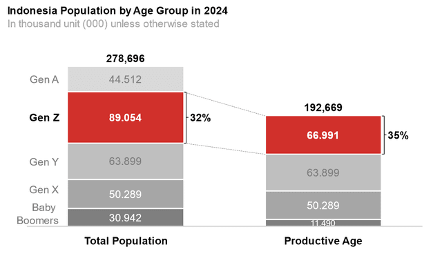 In 2024, Gen Z constituted the largest population group in Indonesia, with 89,054,000 individuals—32% of the nation’s total population of 278,696,000. This cohort also makes up 35% of Indonesia’s productive age population, solidifying its position as a critical market for businesses across sectors.