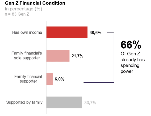 As Gen Z matures, their purchasing power is growing rapidly. Data reveals that 66% of Gen Z now possess financial independence. A significant portion (38.6%) earns their income without relying on family support, while 21.7% act as primary financial providers for their households, and 6% contribute as secondary financial supporters.