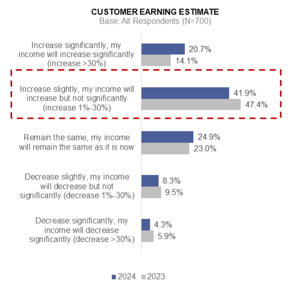 As shown in Figure 1, most customers expect their income to increase in 2024. About 41.9% of customers believe their income will grow by 1–30%. There is also a notable rise in the number of customers expecting their income to increase by more than 30%, with a 6% growth compared to the previous year. This anticipated income growth will undoubtedly influence their financial priorities for 2024.
