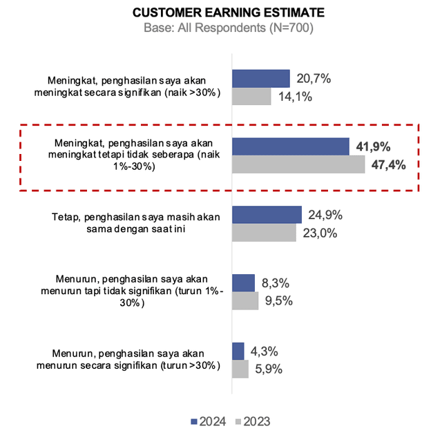 Terlihat pada gambar 1 bahwa di tahun 2024, Sebagian besar customer berekspektasi bahwa penghasilan mereka akan meningkat ditahun 2024. Dimana 41,9% customer merasa bahwa penghasilan mereka akan meningkat sebesar 1-30%. Dan terjadi peningkatan secara signifikan pada customer yang merasa penghasilan mereka akan meningkat diatas dari 30%, dibandingkan tahun sebelumnya terdapat sekitar 6% customer yang merasa akan memiliki penghasilan yang meningkat. Hal ini tentunya akan berpengaruh terhadap financial priorities mereka ditahun 2024.